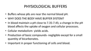 Physiological buffers serve the same purpose. These are not part of buffer. Carbonate buffers in the blood control ph and i believe phosphate buffers are also common physiological buffers.