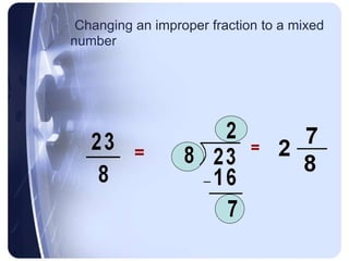 The calculator provided returns fraction inputs in both improper fraction form as well as mixed number form. What is 2.5 in fraction form? Since there is 1 1 number to the right of the decimal point, place the decimal number over 101 10 1 (10) ( 10).