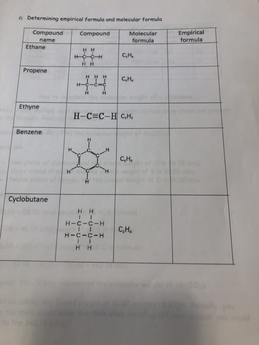 Solved: Determining Empirical Formula And Molecular Tormulo Compound Name Ethane Compound Molecular Iormula Empirical Formula Gh: Propene Ch; Ethyne H-C=C-H Gh; Benzene Ch Cyclobutane H-C-C-H Gh; A-C-C-H H
