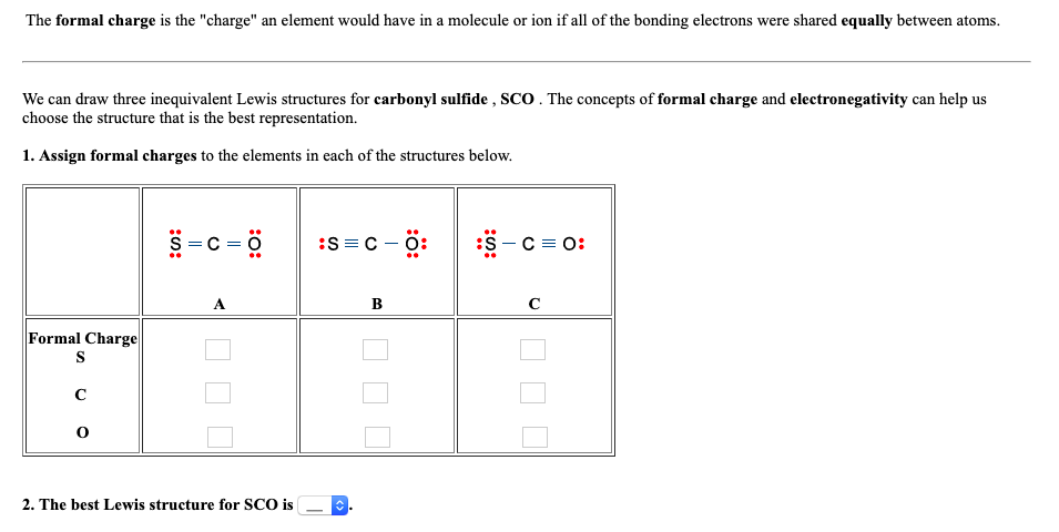 'the formal charge is the charge' an element would have in molecule or ion if all of the bonding electrons were shared equally between atoms_ we can draw three inequivalent lewis structures for carbonyl sulfide sco the concepts of formal charge and electronegativity can help us choose the structure that is the best representation_ 1. We can draw three inequivalent lewis structures for carbonyl sulfide, sco. Carbonyl sulfide (cos) is the most abundant sulfur gas in the troposphere.