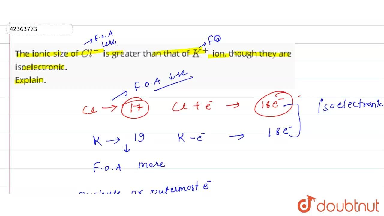 The Ionic Size Of Cl^(-) Is Greater Than That Of K^(+) Ion, Though They Are Isoelectronic. Explain.