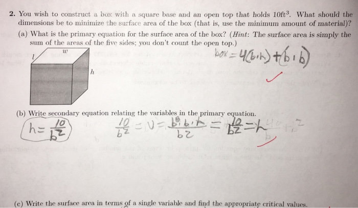 Base area = 1 · 1. In general the it will be (using w =width for base, l =length for base, and h =height) s = w ⋅ l + 2 ⋅ w ⋅ h + 2 ⋅ l ⋅ h (only one w ⋅ l because its. A box is to have an open top, vertical sides, a square bottom, and a volume of 32 m3.