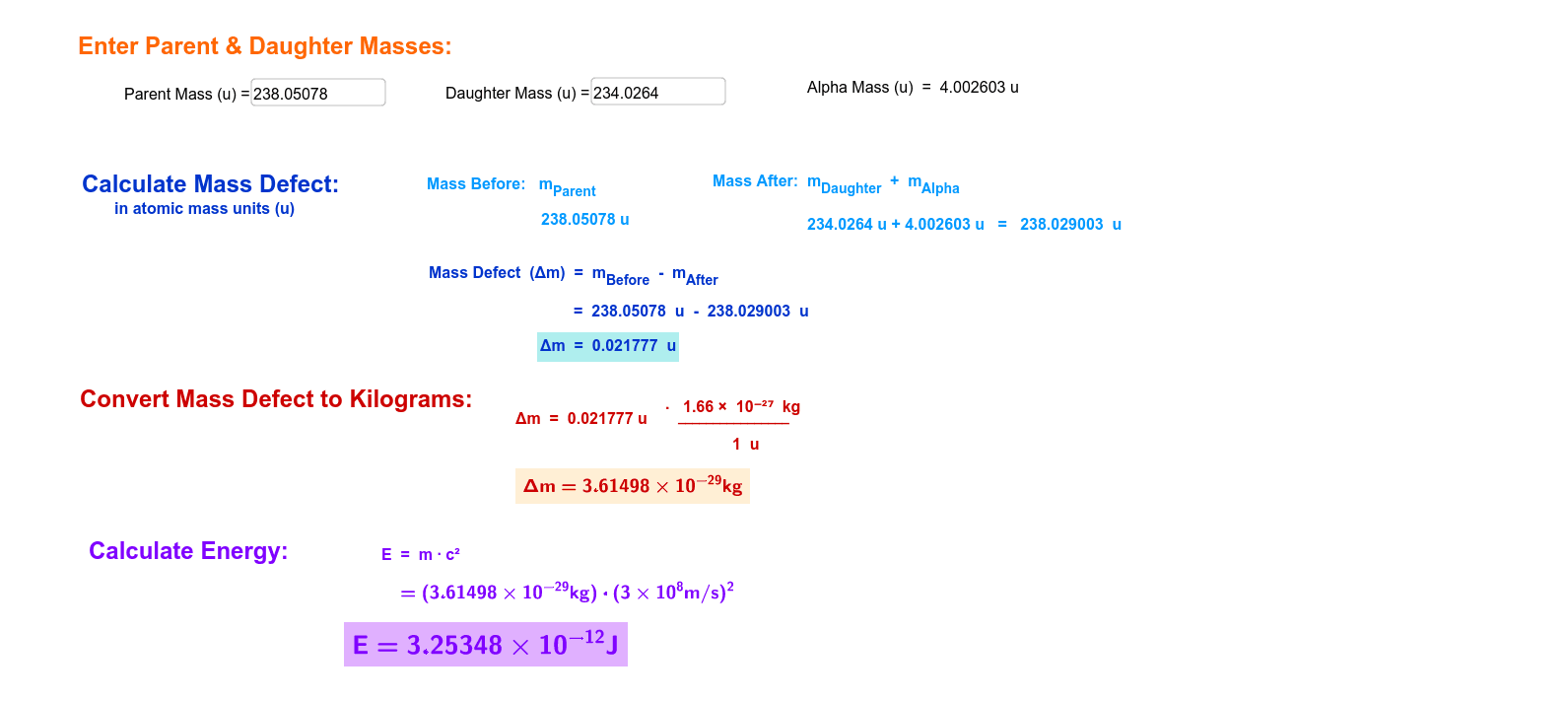 An example will show the use of this equation. Xa z ⇒ xz − 2a4 − + he4 2 for this example, this reduces to, ra226 88 ⇒ rn222 86 + he4 2 the energy released by this decay can be calculated by simply finding the mass difference between the initial and final nuclear states, and converting this mass difference into an energy difference. Physics homework example showing how to calculate the energy released in alpha decay of plutonium 94.